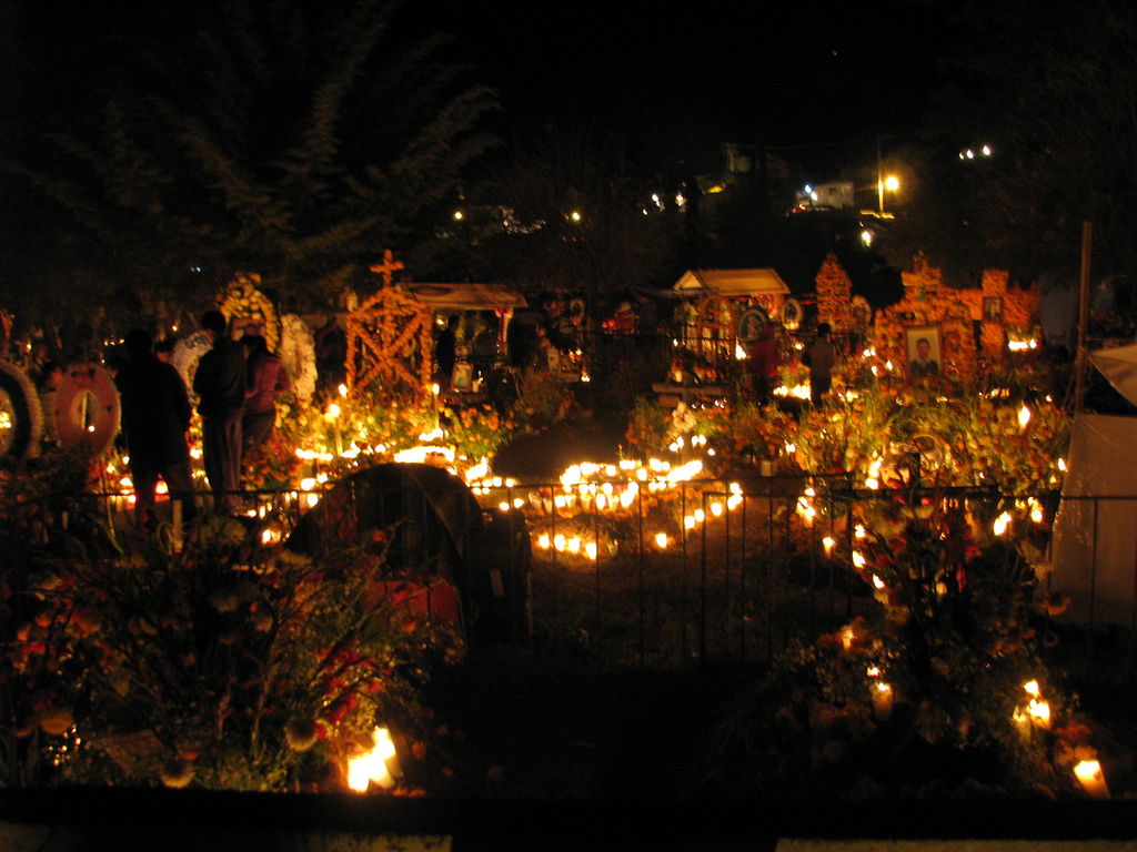 Mágicamente, una especie de encantamiento se apodera del lugar, cuando empieza a teñirse en el ambiente el interminable sonar de la campana colocada a la entrada del cementerio y que marca el camino para que las almas encuentren el campo santo, donde los familiares vivos pasan la noche entonando alabanzas, rezos y suaves cantos en tarasco, que le dan la bienvenida a sus seres queridos que por algunas horas, convivirán todos juntos a la luz de la velas.