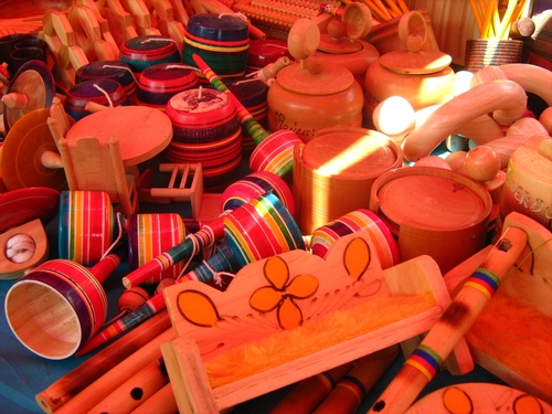 Integrada por 328 piezas, entre sonajas, silbatos, matracas, canicas, trompos, yoyos, baleros y la tradicional muñeca de trapo, los juguetes están elaborados con materiales como palma, tule, carrizo, totomoxtle (hoja de maíz, tela vidrio, cerámica plástico y madera).