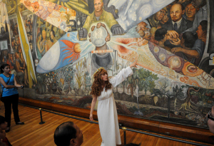 En un momento mágico, aquella singular escultura que representa a la “Armonía” y que se encuentra en la parte exterior del Palacio de Bellas Artes, cobra vida para llevar de la mano al público por una breve historia de este recinto así como de algunos de sus