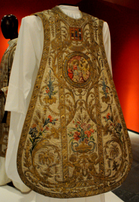 Se exhiben estolas, mitras, sotanas y toda aquella vestidura que es utilizada por un sacerdote para realizar el rito católico y que fueron creadas en hilos de oro, seda y plata. Estas piezas llegaron en su mayoría desde España a México, donde en aquélla época se generó una importante industria en torno a los ornamentos litúrgicos.
