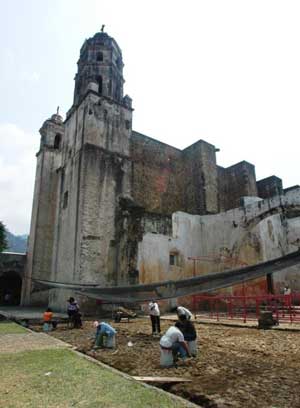 Descubren empedrado original en el atrio del Ex-Convento de la Natividad de María en Tepoztlán
