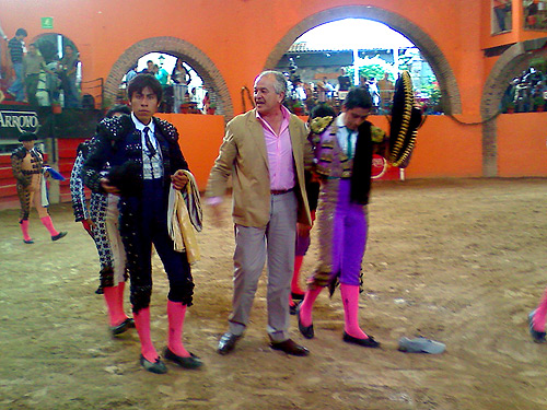El empresario de la Plaza de Toros Arroyo, Don José Arroyo en compañía del ganadero Jorge de Haro y el novillero Adrián Padilla que cortó la única oreja del festejo, dieron triunfal vuelta al ruedo al término de la cuarta novillada en el coso tlalpense, el poblano Michel Matta, escuchó