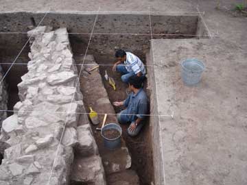 Durante la investigación, dijo, se determinó la presencia de cuatro muros que corren paralelos, de los cuales se desenterraron 4 m de la fachada, lo que permitió conocer las características del sistema constructivo y temporalidad; “se trata de obras de ampliación de la plataforma realizadas durante los periodos Posclásico Temprano (900-1100 d.C.) y Medio (1100-1350 d.C.)”.