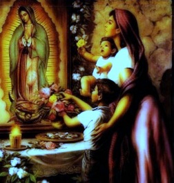 Desenvolvió luego su blanca manta, pues tenía en su regazo las flores; y así que se esparcieron por el suelo todas las diferentes rosas de Castilla, se dibujó en ella y apareció de repente las preciosa imagen de la siempre Virgen Santa María, Madre de Dios, de la manera que ésta y se guarda hoy en su tempo del Tepeyácac, que se nombra Guadalupe.