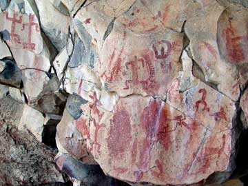 Las improntas aluden a figuras humanas, plantas y animales —algunos de ellos semejantes a seres fantásticos—, así como algunos trazos geométricos y manos en colores rojo y negro, hechos por grupos de cazadores-recolectores.
