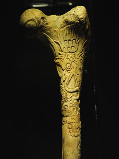 Una de las piezas más importantes del ajuar funerario en exhibición es un hueso de una especie pequeña de venado (yuc) —de apenas 20 cm de largo—, que tiene impresa en bajorrelieve una escena alusiva al inframundo, y un texto de 12 bloques jeroglíficos escritos en doble columna.