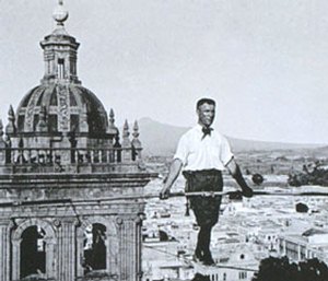 Ciudad de México.- 8 de Noviembre de 2012.- Fotografías que en planos generales retratan a cientos de personas que ansiosas y congregadas frente a la Catedral de Puebla miran hacia el cielo, además de retratos de El Hombre Mosca en donde se le puede ver sentado y posando para la cámara, rodeado de cientos de cables o ejecutando el temerario “Paso del Niágara”, son algunas de las imágenes que se podrán encontrar en la exposición Babe White: El Hombre Mosca que la noche de este miércoles 7 de noviembre fue inaugurada en la Fonoteca Nacional del Conaculta.