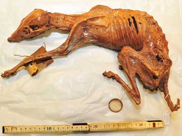 “Para la región norte del país, son pocos los esqueletos de cánidos encontrados en contextos funerarios prehispánicos, y este perro momificado —de aproximadamente 42 cm de largo y 22 de alto— es el único que se ha hallado en México en tales condiciones”, informó el arqueólogo Alejandro Bautista Valdespino, subdirector de Registro de Bienes Arqueológicos Muebles, del INAH.