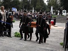 Con la presencia de familiares de los difuntos ilustres, además de miembros de la comunidad cultural de México, los cadetes del Heroico Colegio Militar llevaron a cabo, frente a la llama encendida de la Rotonda, el acto protocolario del traslado de los restos hasta las criptas ubicadas en el ala oriente del santuario.