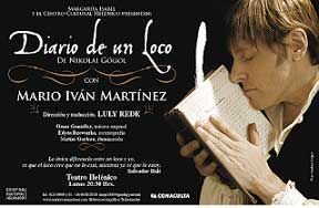 Ciudad de México.- 20 de Agosto de 2013.- A finales de este mes, los días 29 y 30 de agosto, el Teatro del Bicentenario presenta la obra teatral Diario de un loco, espectáculo unipersonal en el que el actor Mario Iván Martínez da vida al protagonista de la obra clásica, escrita por Nikolai Gógol (1809-1852), con adaptación de Luly Rede y del propio intérprete.