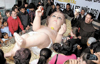 El Niño Dios está conformado por una estructura de acero soldada, además de su ropón y una silla de madera, la cual tiene cuatro metros de altura por 1.50 de ancho y dos metros de espesor.