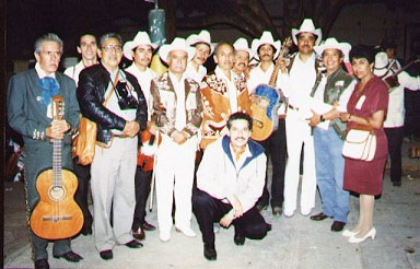 Foto 1: Don Reynaldo en un homenaje a don Heliodoro Copado junto a numerosos personajes huapangueros.