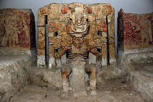 Con los brazos extendidos sobre su trono, la deidad prehispánica simula incorporarse para estar en comunión con quienes habitan su reino. Por haberse creado hace más de un milenio (300-900 d.C.), resulta increíble que esta escena conserve toda su fuerza expresiva.