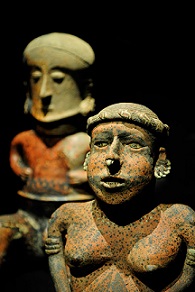 Otras representaciones, provenientes del Museo Regional de Colima, son la de una mujer embarazada sentada, de barro cocido con policromía, del Preclásico Tardío-Clásico Medio (200 a.C. – 600 d.C.), y de un hombre sonriente, manufacturado con las mismas técnicas, correspondiente al periodo Clásico-Clásico Medio (200 – 600 d.C.).