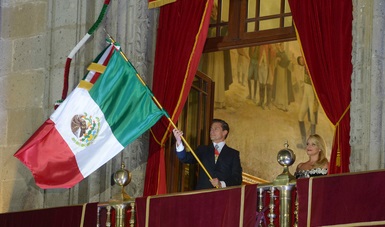Luego de recibir la bandera de manos de una escolta femenina, el mandatario federal salió al balcón de Palacio Nacional para emitir su mensaje con motivo del 207 aniversario de la Independencia de México.