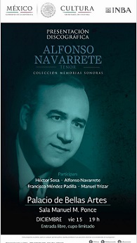 Lidia Camacho, directora del INBA, afirmó que Alfonso Navarrete es considerado una de las figuras más importantes de nuestro país y por ello en la sexta producción discográfica de la Colección Memorias Sonoras, se enfatiza el talento y legado de este cantante para que las nuevas generaciones puedan conocerlo.