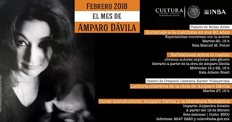 Como complemento de esta serie de actividades, la escritora Alejandra Amatto impartirá el curso introductorio Amparo Dávila y la literatura fantástica mexicana, los lunes de las 17:00 a las 19:00, del 12 de febrero al 12 de marzo, en el Centro de Creación Literaria Xavier Villaurrutia.