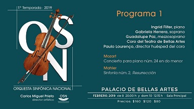 El programa 1 de la temporada 2019 de la OSN se llevará a cabo los días viernes 8 de febrero a las 20:00 y el domingo 10 a las 12:15 en la Sala Principal del Palacio de Bellas Artes.