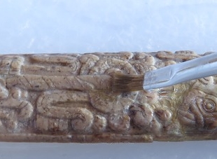 “El siguiente proceso, en las piezas que así lo requerían, fue la unión de fragmentos y el resane de grietas y faltantes para darles estructura y continuidad visual. Por último, se hizo la reintegración cromática de los milimétricos resanes para lograr una mejor apreciación de la pieza”, detalla Sara Fernández.