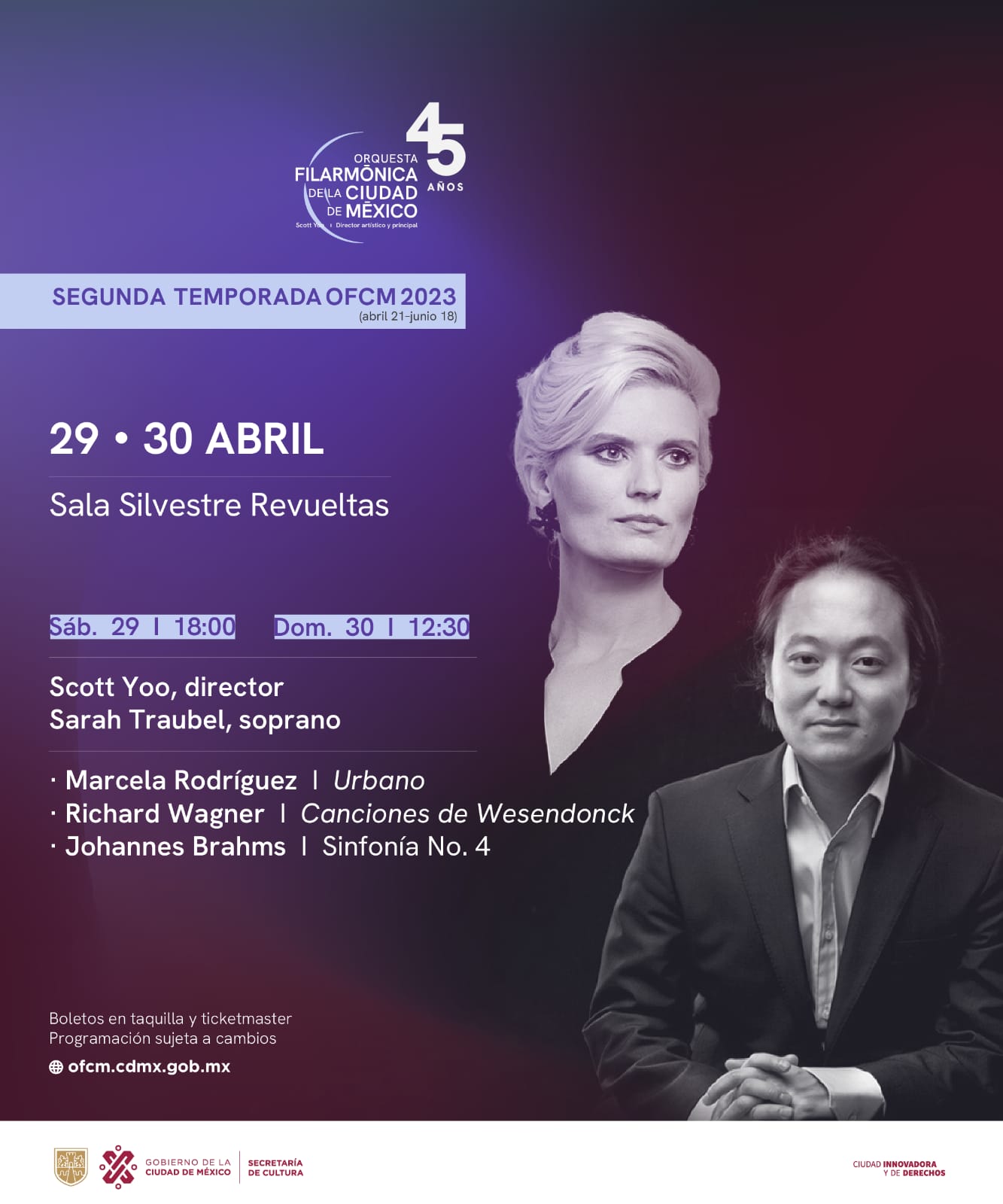 ● La intérprete vocal alemana acompañará a la agrupación capitalina por primera vez con la ejecución de Canciones Wesendonck, de Richard Wagner ● Asimismo, bajo la batuta de su director artístico, el maestro Scott Yoo, la OFCM tocará Urbano, de Marcela Rodríguez y la Sinfonía No. 4, de Johannes Brahms ● Este fin de semana en “Miradas a nuestro…