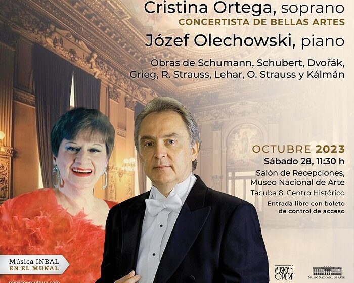 La voz de la soprano Cristina Ortega, concertista de Bellas Artes, acompañada del pianista Jozef Olechowski, serán los intérpretes de esta entrañable sesión de lied y opereta. Ortega debutó en el Palacio de Bellas Artes interpretando a Violeta Valery en La traviata, de Verdi.