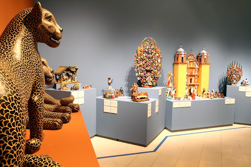 Entre las piezas destacadas se encuentran variadas técnicas como amates decorados con tinta china representando a la imagen de la Virgen de Guadalupe, un tren hecho de carrizo, árboles de la vida de barro moldeado y un baúl de madera tallada original de Olinalá, Guerrero. Además, se resaltan las blusas bordadas en punto de cruz realizadas en Yucatán.