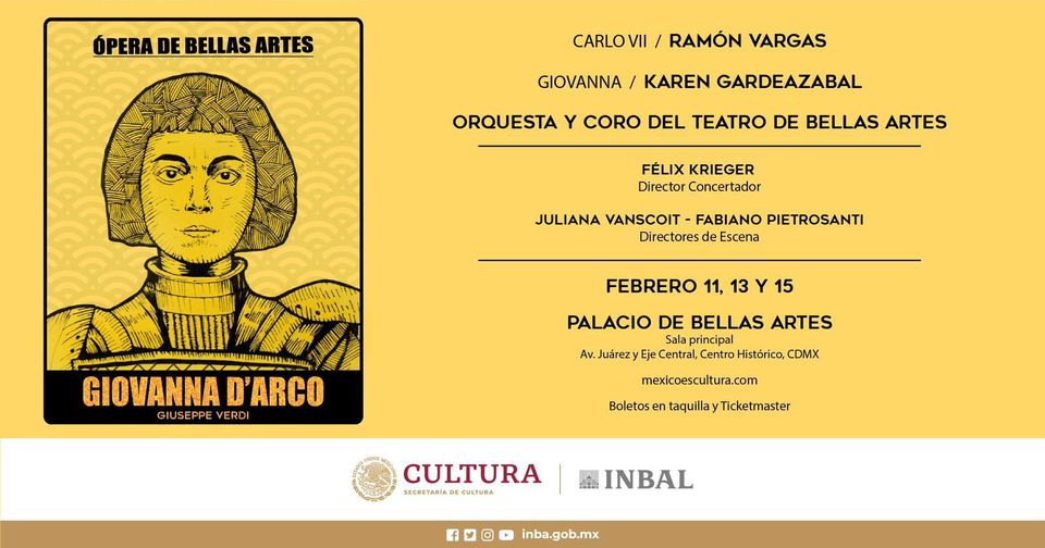 Las funciones de Giovanna d’Arco serán los días 11, 13 y 15 de febrero en la Sala Principal del Palacio de Bellas Artes. Boletos a la venta en las taquillas del Palacio de Bellas Artes y en el sistema Ticketmaster.