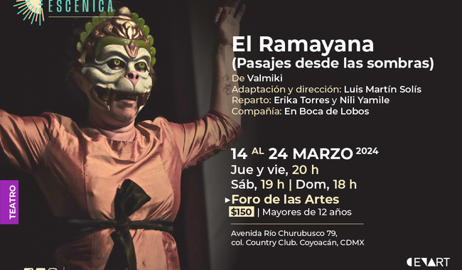 CDMX.- 6 de marzo de 2024.- (https://www.gob.mx/cultura/prensa) El Centro Nacional de las Artes (Cenart), institución de la Secretaría de Cultura, presentará la puesta en escena El Ramayana (Pasajes desde las sombras), una producción del Mérida Fest 2023 y En Boca de Lobos Producciones, que ofrecerá temporada del 14 al 24 de marzo, en el Foro de las Artes.