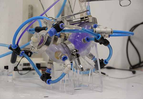“Este es un estómago artificial con el que tratamos de emular el funcionamiento de un estómago humano. Lo hemos utilizado para desintegración de alimentos de manera muy exitosa con salchicha y melón, y funciona exactamente que el órgano natural, con tres y medio ciclos por minuto, se añaden jugos biliares y vemos la capacidad de desintegrar los alimentos”, detalló Ascanio Gasca.