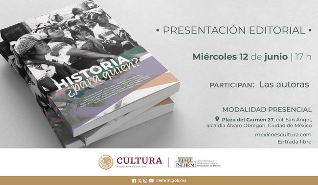 CDMX.- 10 de junio de 2024.- (https://www.gob.mx/cultura/prensa) Para impulsar la divulgación de la historia, en apego a su función social para la formación de una sociedad crítica y participativa, el Instituto Nacional de Estudios Históricos de las Revoluciones de México (Inehrm), institución de la Secretaría de Cultura del Gobierno de México, en colaboración con el gobierno del estado de Veracruz, invita a la presentación del libro Historia ¿para quién?, el cual reúne los ensayos elaborados en 2020 y 2022 por un grupo de 14 historiadoras e investigadoras.