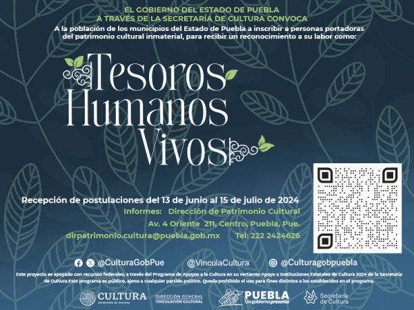 La dependencia seleccionará a seis “Tesoros Humanos Vivos”, quienes recibirán un apoyo económico de 60 mil pesos como reconocimiento a su contribución en la cultura poblana; además de 20 mil pesos para realizar un evento de transmisión (taller, plática, registro, exposición o demostración) dirigido a mínimo 50 jóvenes, en el que brinden información sobre la manifestación cultural que ellos practican y cómo pueden participar en su continuidad.