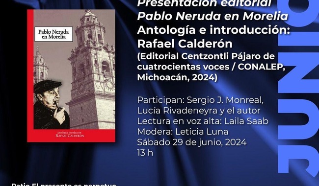 CDMX.- 25 de junio de 2024.- (https://www.gob.mx/cultura/prensa) En el marco del 120° aniversario del natalicio del poeta chileno Pablo Neruda (12 de julio, 1904 – 23 de septiembre, 1993), la Casa Marie José y Octavio Paz presentará la antología Pablo Neruda en Morelia (Editorial Centzontli Pájaro de Cuatrocientas Voces / CONALEP Michoacán, 2024), libro donde el poeta y ensayista michoacano Rafael Calderón reúne fotografías, poemas y documentos que dan fe del legado y la relación que el Premio Nobel de Literatura 1971 sostuvo con la vida y la cultura del estado de Michoacán.