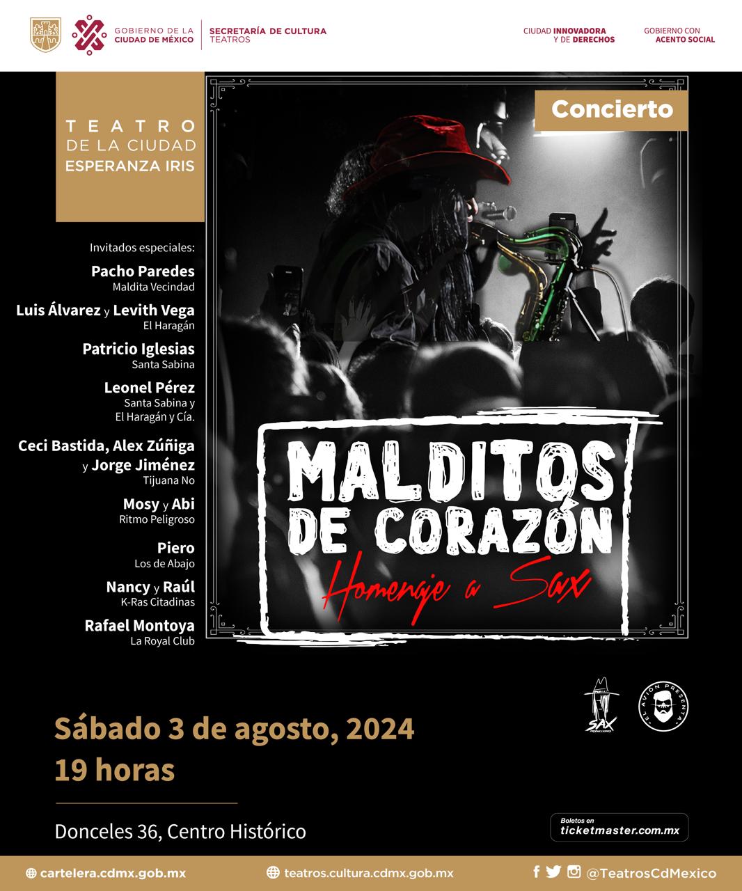 El Homenaje a “Sax” a cargo de Malditos de Corazón e invitados tendrá lugar el próximo 3 de agosto a las 19 horas en el Teatro de la Ciudad Esperanza Iris, ubicado en Donceles 36, Centro Histórico, Ciudad de México. Los boletos se pueden adquirir en taquillas del recinto o a través de Ticketmaster.