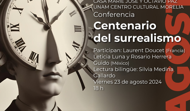 El viernes 23 de agosto, a las 18:00 h, el Centro Cultural Morelia de la Universidad Nacional Autónoma de México (UNAM) será sede de la conferencia “Centenario del surrealismo”, donde el director de la Casa André Breton en Francia, Laurent Doucet; la poeta y académica Rosario Herrera Guido y la directora de la Casa Marie José y Octavio Paz, Leticia Luna Aguilar, conversarán respecto de la importancia del movimiento artístico y literario considerado como uno de los más destacados dentro de la cultura.