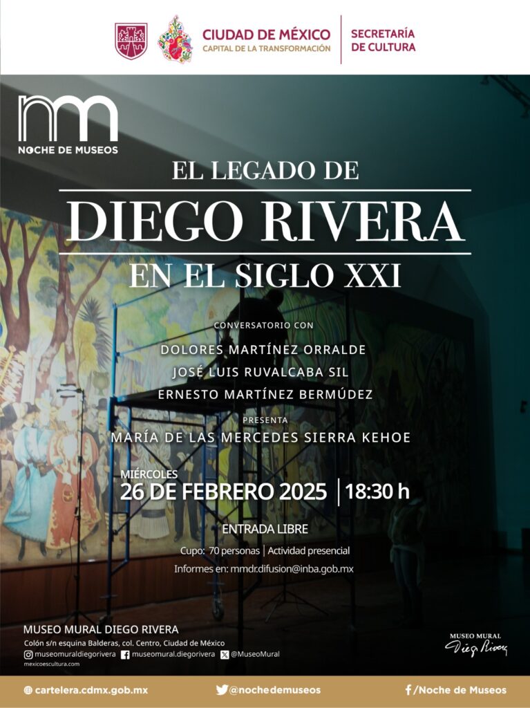 El Museo Mural Diego Rivera preparó un conversatorio, a las 18:30 horas, en el que las y los visitantes podrán conocer el legado que dejó el pintor y muralista guanajuatense, a través de expertos que compartirán aspectos técnicos del mural “Sueño de una tarde dominical en la Alameda Central”, como los materiales utilizados en el fresco y las transformaciones que ha surgido la obra desde su creación. La entrada es libre con cupo para 70 personas.