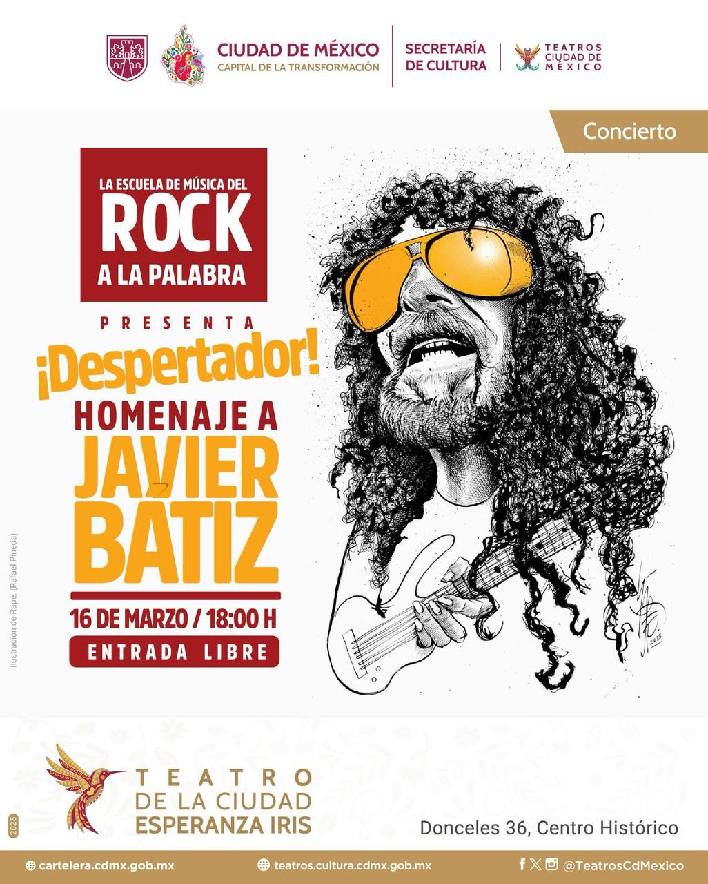 CDMX.- 13 de marzo de 2025.- (https://cultura.cdmx.gob.mx/comunicacion) La Secretaría de Cultura de la Ciudad de México, a través de la Dirección del Sistema de Teatros y la Escuela de Música del Rock a la Palabra, rendirá un concierto homenaje, de entrada libre a una de las leyendas del rock mexicano, Javier Bátiz, a tres meses de su fallecimiento, ocurrido el pasado 14 de diciembre, en el Teatro de la Ciudad Esperanza Iris este domingo 16 de marzo a las 18 horas.