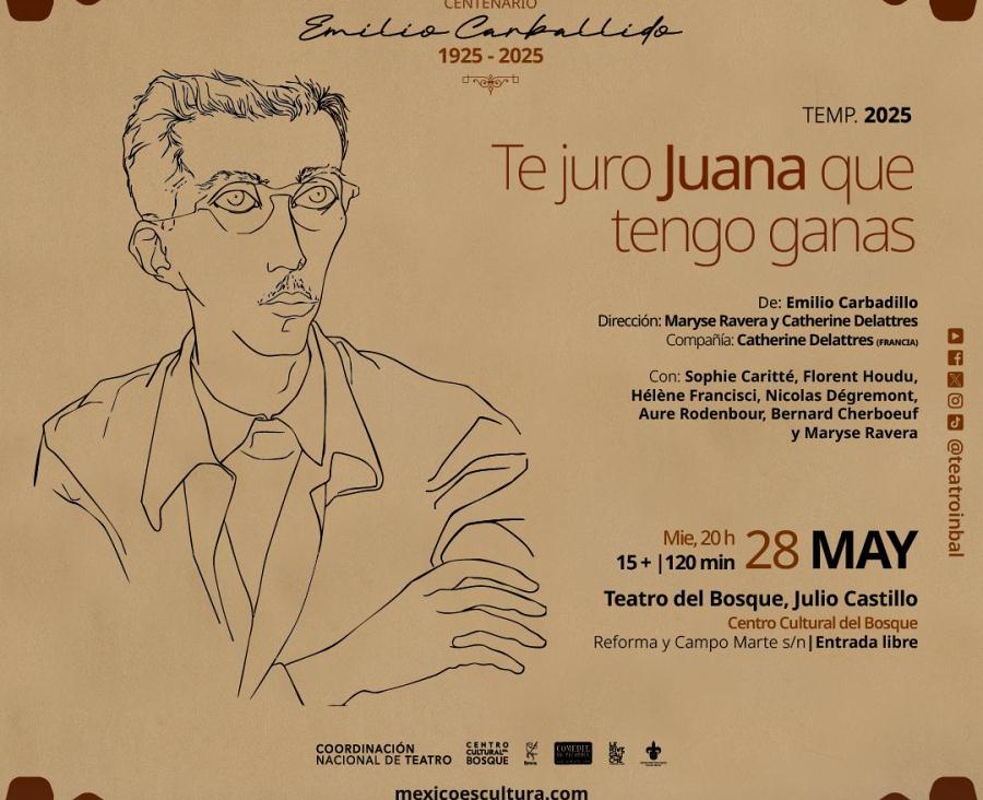 CDMX.- 23 de mayo de 2025.- (https://www.gob.mx/cultura/prensa) En el marco del centenario del nacimiento de Emilio Carballido (1925-2008), la Secretaría de Cultura del Gobierno de México y el Instituto Nacional de Bellas Artes y Literatura (INBAL), a través de la Coordinación Nacional de Teatro, en colaboración con la Compagnie Catherine Delattres, presentan la puesta en escena Te juro, Juana, que tengo ganas, dirigida por Catherine Delattres y Maryse Ravera, con las actuaciones de Sophie Caritté, Florent Houdu, Hélène Francisci, Nicolas Dégremont, Aure Rodenbour, Bernard Cherboeuf y Maryse Ravera.