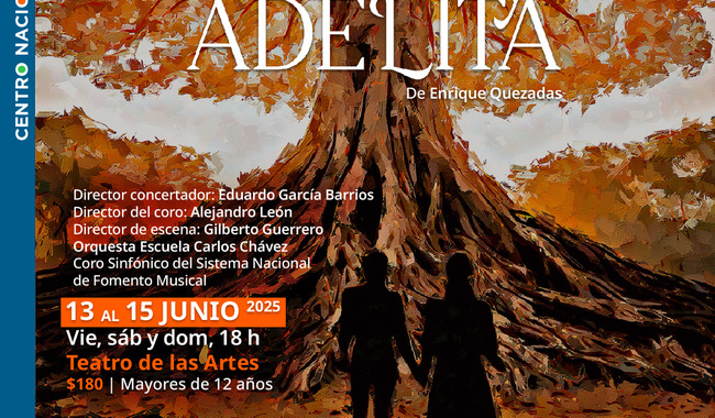 CDMX.- 29 de mayo de 2025.- (https://www.gob.mx/cultura/prensa) El Centro Nacional de las Artes (Cenart), institución de la Secretaría de Cultura del Gobierno de México, será sede del estreno mundial de Juan y Adelita, la primera ópera del compositor y cantautor Enrique Quezadas, a cargo de la compañía Delirio Teatro, los días 13, 14 y 15 de junio en el Teatro de las Artes.