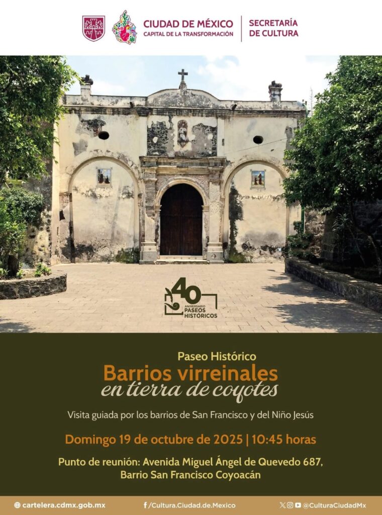 El segundo paseo del mes se reanuda el domingo 19 de octubre con el recorrido llamado “Barrios virreinales en tierra de coyotes” para adentrarte en dos de los barrios más antiguos de Coyoacán: San Francisco y del Niño Jesús, donde las leyendas virreinales, las iglesias centenarias y las callejuelas empedradas cuentan historias de frailes, cronistas y viajeros.